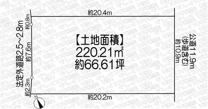 | 接道 | 南東 11.9m(幅員) 公道 10.9m(接面) 北西 2.5m(幅員) 法定外道路(公道) 10.7m(接面) |