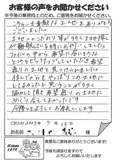 住んでからもやっぱりこの土地にしてよかったと思うことが多く協力して頂き希望通りの土地にめぐり合えてよかったです。